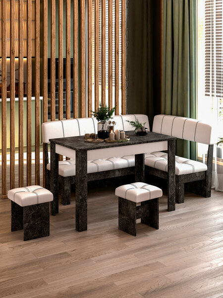 Кухонный уголок «Альфа» представляет собой полноценное функциональное и удобное место для размещения большого количества человек за одним столом. Это классический уголок, разработанный с учётом современных тенденций. За счёт удобства и уюта он станет главной частью кухни, где захочется проводить больше времени. Каркас кухонного уголка изготовлен из ЛДСП 16 мм. Этот материал отличается прочностью, надёжностью и способностью прослужить много лет. В обработке торцов используется кромка ПВХ. Для мягкости применяется практичный наполнитель ППУ, который имеет высокий уровень влагообмена и воздухопроницаемости. Уголок выполнен в популярных цветовых сочетаниях, которые придадут ему интересный, выразительный внешний вид. Сборка скамьи в этом наборе возможна как на левую, так и на правую сторону. Поэтому уголок «Альфа» станет хорошим вариантом для приобретения, ведь расположить его с легкостью можно будет в любой планировке.
