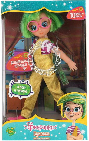 Озвученная интерактивная кукла Фееринки, кукла для девочки с крыльями, Буковка, Бусинка, поет и говорит 10 фраз и песен, 26 см. Станет отличным подарком для поклонниц мультсериала "Фееринки". Буковка - юная фея знаний с короткими ярко-зелёными волосами. Она очень умная, носит круглые розовые очки. Фееринка одета в комбинезон горчичного цвета и полосатую футболку. С такой стильной куклой девочке будет интересно и весело играть. Детально проработанный дизайн куклы и светящиеся в темноте крылья вдохновят малышку на новые игровые сюжеты. Игра с куклой развивает: социально-коммуникативные навыки, ответственность, музыкальный слух, воображение и фантазию, чувство стиля. Материал: пластмасса + текстиль. Работает от 3-х батареек типа LR44 (в комплекте). Рекомендовано детям от 3-х лет. Внимание! Установлены демонстративные батарейки, рекомендуется заменить!