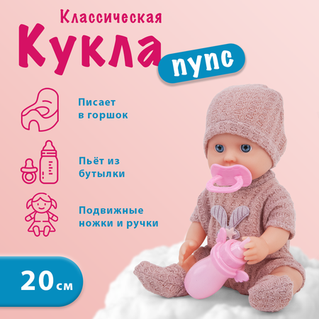 Кукла Пупс 20см. Функции: пьёт из бутылочки, ходит в туалет в горшок, подвижные ручки и ножки. В наборе: Кукла Пупс, бутылочка, соска, горшок. Можно купать и переодевать. Удобно брать с собой: в сад, в гости, на улицу. Пупсик станет отличным подарком на новый год или день рождения для вашей дочки или внучки и поможет попробовать себя в роли мамы. Куколка станет любимой игрушкой вашего ребенка! Играя с пупсом, девочки не просто играют в игры, они заботятся о маленьком ребенке. Ваша девочка сможет почувствовать себя настоящей матерью, заботясь о своем пупсике. Благодаря высокому качеству изготовления, эта кукла будет служить долго и безопасно для вашего ребенка. Пупс упакован в пакет.
