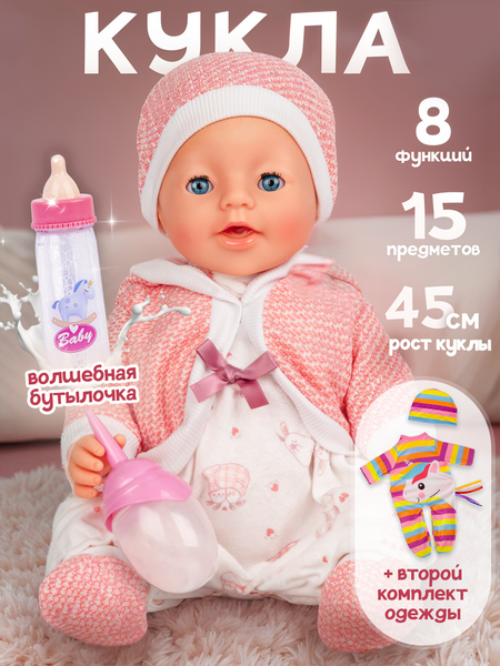 Интерактивная кукла пупс от BestLike - отличный подарок для девочки. Игра в «Дочки-матери» поможет вашей малышке развить такие черты, как: забота о малышах, основы ухода за детками, ответственность. Вся одежда малыша выполнена из приятного на ощупь текстиля (все материалы гипоаллергенны). У куклы черты лица имеют высокую детализацию и красивые глаза, подвижные конечности и твердое тело. Пупсики из этой серии предлагаются в разных костюмчиках и набором аксессуаров. Пупс имеет 7 функций: 1. пьет из бутылки. 2. писает (при нажатии на кнопку на пупке). 3. плачет настоящими слезами (чтобы кукла заплакала необходимо ее напоить из бутылочки и нажать на правую ручку, либо согнуть правую ручку в локте). 4. можно купать. 5. подвижные руки, ноги и голова. 6. закрывает глаза. 7. сосет соску (пустышка вставляется и держится во рту). В комплект входят: 2 бутылочки для кормления, 2 комплекта одежды для пупса, горшок, тарелочка, ложка, соска, 2 подгузника. Одна бутылочка с откручивающейся крышкой позволяет наливать воду и поить куклу. Вторая бутылочка с «исчезающей жидкостью» удивит малыша: при наклоне «молочко» стекает по стенкам, создавая иллюзию, что бутылочка пуста, а при возвращении в исходное положение, жидкость распределяется по стенкам, и ёмкость выглядит наполненной. Игрушки для девочек от BestLike станут отличным подарком на Новый год, День рождения и любой другой праздник. Данный подарочный набор для девочки разнообразит игровые сценарии и поможет развить полезные навыки.