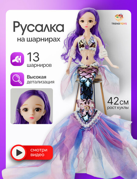 Шарнирная кукла русалочка с хвостом - мечта любой девочки. Шикарная русалка с элегантным большим хвостом подарит массу удовольствия вашему ребенку. Куклы для девочек оживают благодаря подвижным шарнирам, позволяя придумывать захватывающие приключения. Русалки поражают воображение своей грацией и возможностью изменяться, ведь кукла русалка идет в наборе со съёмным хвостом, снимая его можно переодевать шарнирную куклу, что позволит легко превращать её из морской обитательницы в стильную. Размеры куколки русалки составляют 30 см и 42 см с хвостом. Кукла русалочка станет не только красивым дополнением к интерьеру, но и поможет вашему ребенку развивать свои творческие способности и социальные навыки.