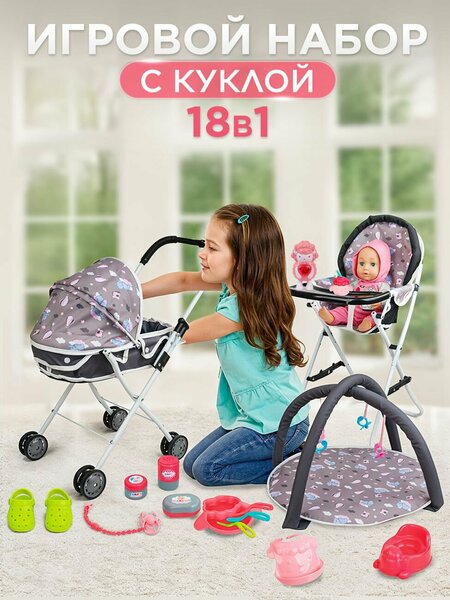 Подарочный набор для девочки 18 в 1 состоит из куклы-пупса и комплекта аксессуаров для ухода за ней. Такой набор из куклы пупса, коляски для кукол с капюшоном, детского коврика манежа, стульчика для кормления и набора аксессуаров станет отличным подарком для детей от 3 лет — он надолго увлечет ребенка и поможет развить ролевые навыки и воображение. Что входит в набор: Реалистичная кукла для девочки с одеждой на липучках умеет пить и писать (сразу). Голова и ручки выполнены из приятного на ощупь винила, а ножки и туловище из пластика. Не имеет гендерных признаков. Кукла издает 10 звуков, включая плач, смех, лепет и фразы «мама» и «папа» — для этого необходимо вытащить защитную чеку из звукового блока, который находится на животике и работает от трех батареек типа LR44 (идут в комплекте). Коляска для кукол со складным механизмом и перекидным капюшоном. Манеж для кукол с мягкими дугами, украшенный сосками-аксессуарами Игрушка ночник в форме барашка: Ночник проигрывает 4 мелодии общей длительностью 3 минуты 40 секунд, имеет подсветку и фиксированную громкость. Работает от трех батареек типа LR44 (идут в комплекте). Аксессуары для кормления и ухода : Бутылочка для кормления, тарелочка, пластиковый фартучек для кормления, вилка, ложка и нож, баночки «крем», «мыло» и «присыпка» с открывающимися крышками. А также миниатюрный ночной горшок и соска на цепочке. Все элементы набора изготовлены из гипоаллергенных материалов и не имеют острых углов. Игра с куклой способствует развитию ролевых навыков, заботы, ответственности и эмпатии у ребёнка.