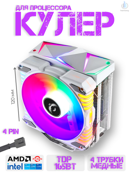 Кулер для процессора Белый - башня 4 тепловых трубок, вентилятор 120mm, с подсветкой RGB
