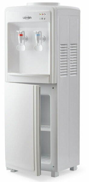 Кулер напольный без охлаждения. С опцией нагрева. Для дома и офиса! Имеет удобный шкафчик с 1 полкой, объем 9 л. Современный дизайн. Цвет корпуса белый. Два крана, управление кнопками - горячая и холодная вода. Кран горячей воды имеет "защиту от детей".