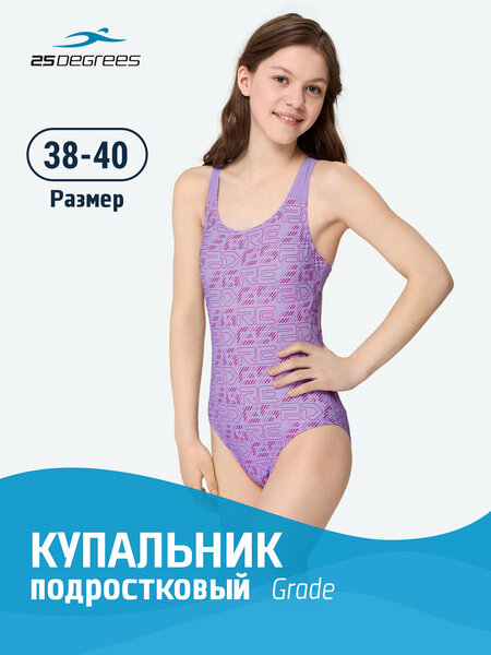 Внимание! Мы не можем принять данный товар обратно из гигиенических соображений. Уважаемые покупатели, при выборе подходящего размера, просим ВАС обращаться К размерной сетке, ОНА находится В карточке товара (2 слайд). Удобный, стильный и заметный, - именно таким должен быть подростковый спортивный купальник! Слитный купальник Grade бренда 25DEGREES – продуманная модель, оптимальная как для тренировок в бассейне, так и для отдыха на открытой воде. Удобный крой не ограничивает свободу движений, позволяя юной спортсменке чувствовать себя максимально комфортно. Широкие лямки надежно держатся на плечах и не смещаются во время активных гребков, а оригинальная открытая спинка подчеркивает индивидуальность. Спортивный купальник Grade выполнен из эластичного быстросохнущего полиамида с добавлением эластана, дополнительно обработанного специальными средствами для защиты от хлорированной воды и ультрафиолета. Материал долговечен и практичен, он устойчив к образованию катышек и быстро сохнет. Плоские и аккуратные швы не натирают кожу и не мешают двигаться, поэтому плавать в таком закрытом купальнике комфортно. Полная передняя подкладка с резинкой под грудью обеспечивают дополнительную поддержку и придает уверенности юным спортсменкам во время всего процесса тренировки. Преимущества: Полная передняя подкладка; Резинка под грудью; Быстрое высыхание; Устойчивость к образованию катышек; Двусторонняя эластичность; Плоские швы. Характеристики: Материал основной ткани: 80% полиамид, 20% эластан Материал подкладки: 100% полиэстер Цвет: лиловый Размер: 38, 40 Крой: слитный Форма спинки: открытая Подкладка: полная передняя Поддержка груди: есть Съемные чашечки: нет Защита от УФ-лучей: 30+ Защита от хлора: уровень 3 (120 часов плавания) Вырез бедра: средний Лямки: широкие Тип упаковки: пакет zip-lock с подвесом и термозапайкой Производство: Китай