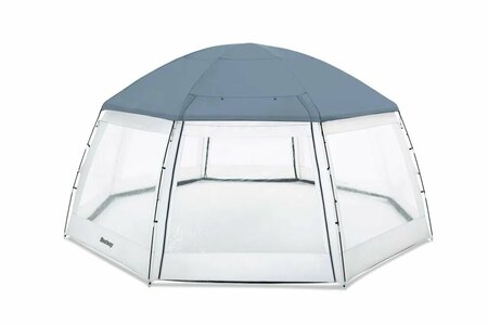 Купол-тент для бассейна Bestway 58612 BW — круглый купол-шатёр, который позволяет спрятаться от солнца жарким днём, защититься от москитов вечером, а также предохраняет бассейн от попадания мелкого мусора. Характеристики: размер: 600х600х295 см; каркас из стекловолокна; два откидывающихся полотна для входа и выхода с противоположных сторон; восемь прозрачных окон из ПВХ; крыша из плотного непромокаемого полиэстера; защита от УФ-излучения (UPF 50+); время установки: 30 минут; в комплекте 16 колышек для крепления дуг к земле, а также сумка-переноска. Предназначен для бассейнов и джакузи до 488 см в диаметре.