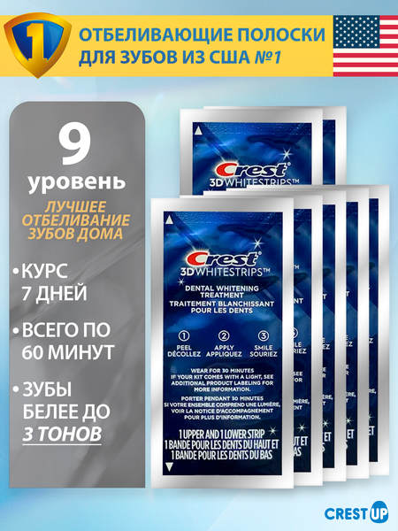 Комплект включает в себя 7 пакетиков, это треть от полного курса «Crest 3D Whitestrips Supreme Bright» – Эффект отбеливания зубов до 3 тонов, а уровень отбеливания 9. Позволят вам достигнуть невероятных результатов. Благодаря технологии «Advanced Seal» полоски не скользят, полностью повторяя форму зубов, а вы не испытываете дискомфорт во время отбеливания. Стоматологическая Ассоциация «ADA» в ряде исследований доказала, что продукт безопасен и эффективен в домашних условиях. В полосках используется тот же отбеливающий компонент, что и в профессиональных стоматологических клиниках. Удаляют старые 25-летние пятна на зубах от кофе, вина, сигарет и других красящих веществ. В состав входят компоненты безопасные для эмали. Отклеиваются также легко, как и приклеиваются. Использовать 1 раз в день в течение 1 часа. Курс отбеливания рассчитан на 7 дней.