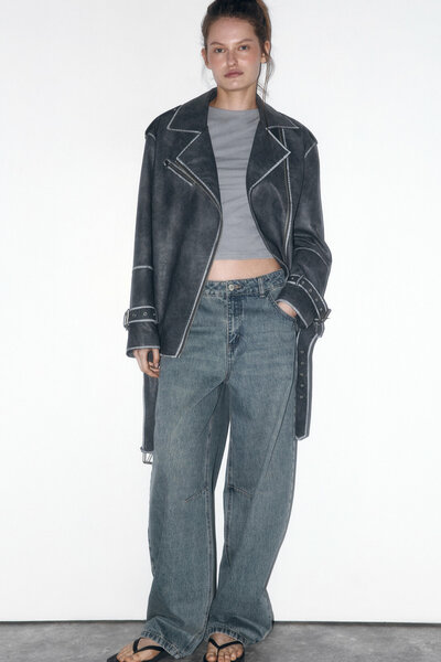 - Удлиненная женская куртка-косуха свободного кроя oversize из плотной фактурной искусственной кожи с приятной к телу подкладкой - Широкий отложной воротник с лацканами. Длинные свободные рукава с прямыми манжетами и декоративными ремешками. Спущенная линия плеча с декоративными погонами на кнопках. Широкий ремень из искусственной кожи с прямоугольной пряжкой и металлическими люверсами снизу. Застежка на косую молнию по всей длине. Два боковых прорезных кармана с застежкой на кнопки, прорезной карман на молнии на груди - Темно-серая косуха с трендовым состаренным эффектом из новой осенней коллекции. Снова в тренде: оверсайз-косуха из искусственной кожи с актуальным вареным эффектом делаве для дерзких аутфитов в байкерском стиле или для повседневных луков с твоими любимыми джинсами, платьями, шортами или юбками. Стильная и универсальная куртка-косуха, которая защитит тебя от ветра и дождя и подойдет как на холодное лето, так и на раннюю осень / позднюю весну - Размер на модели: S
