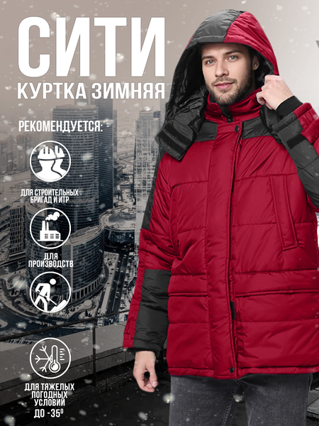 Куртка утепленная "Сити" красная с чёрным, оптом и в розницу с доставкой по всей территории РФ. Куртка прямого кроя до середины бедра. Универсальный вариант зимней одежды для работы или повседневной носки. Особенности пошива и эксплуатации. Центральная застёжка на молнии сверху закрывается ветрозащитной планкой на липучке. На куртке 2 прямых кармана по бокам и 2 косых на груди. В рукавах внутренний трикотажный манжет. Съёмный капюшон на молнии, объём регулируется. Спереди застёгивается на липучку. Один внутренний карман. Обхват куртки регулируется по талии. Воротник стоечка высокий, закрывает горло. Утеплитель синтепон 3 слоя. Во время изготовления соблюдается ГОСТ 12.4.236-2011, ГОСТ 12.4.303-2016, ТР ТС 019/2011 Оттенки ткани могут отличаться от фотографии.