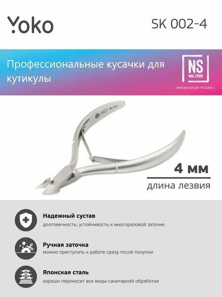 Маникюрные кусачки Yoko SK 002-4 - это профессиональный инструмент высокого качества. Они производятся из японской высоколегированной нержавеющей стали и отличаются превосходным качеством изготовления сустава - важнейшего конструктивного элемента маникюрных кусачек. Инструменты Yoko могут подвергаться всем необходимым обработкам. Важно использовать химические средства с PH более 7 и не нагревать свыше 300 градусов Цельсия. двойная пружина кромка 4 мм