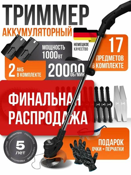 Аккумуляторный триммер - это идеальный инструмент для вашего сада, будь то стрижка газона, подрезка травы или веток кустов. Наш садовый триммер с частотой вращения шпинделя 20000 оборотов в минуту оснащен тремя видами насадок: 10 пластиковыми лезвиями для стрижки газона, 2 металлическими ножами для удаления сорняков и 2 круглыми пильными дисками для удаления кустарников и веток. Устройство дополнено защитным металлическим ограничителем. Он защищает триммер от повреждения твердыми предметами на земле. Прибор оснащен возможностью регулировки высоты и угла скоса, системой быстрой зарядки. Прибор способен спилить ветки до 7 см в диаметре, что позволит вам легко поддерживать порядок в вашем саду. Рукоятка с комфортной ручкой позволяет легко использовать косилку как на небольших участках, так и на больших газонах, а телескопическая штанга регулируется, что позволяет использовать технику людям с любым ростом. Режущая головка вращается, с ней вы легко сможете скосить траву, которая растет вплотную у забора или бордюра, оформить садовую дорожку или клумбу. Газонокосилка работает от аккумулятора Li-lon. Мощность устройства 1000 Вт. Примерная продолжительность работы от полностью заряженной батареи - 20 минут. В комплектации два аккумулятора, а значит вы сможете увеличить время работы при необходимости. Наш триммер легкий, весом 1.95 кг, его несложно переносить. С беспроводным устройством удобно работать везде, где это потребуется и вам не придется беспокоиться о расположении розетки или о мешающихся под ногами во время работы шнурами. Садовый кусторез с мощным аккумулятором способен срезать даже самую жесткую поросль. Модель идеально подходит для стрижки газонов, а также подрезки кустарников и живых изгородей. Мощный двигатель мотокосы позволит вам без проблем избавляться от высокой травы и сорняков, чтобы ваш двор, сад и огород на участке у дома или на даче выглядели наилучшим образом. Универсальный дачный инвентарь - кромкорез отлично подходит для завершения ухода за газоном или поддержания свежего вида клумб. Комплект включает: триммер, 10 пластиковых лезвий, 2 металлических лезвия, 2 пильных диска, 2 аккумулятора на 12В, 1 зарядное устройство, 1 ручку, коробку и инструкцию на русском языке.