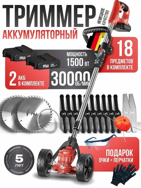 Аккумуляторный триммер - это идеальный инструмент для вашего сада, будь то стрижка газона, подрезка травы или веток кустов. Наш садовый триммер с частотой вращения шпинделя 30000 оборотов в минуту оснащен тремя видами насадок: 10 пластиковыми лезвиями для стрижки газона, 2 металлическими ножами для удаления сорняков и 2 круглыми пильными дисками для удаления кустарников и веток. Устройство дополнено защитным металлическим ограничителем. Он защищает триммер от повреждения твердыми предметами на земле. Прибор способен спилить ветки до 7 см в диаметре, что позволит вам легко поддерживать порядок в вашем саду. Рукоятка с комфортной ручкой позволяет легко использовать косилку как на небольших участках, так и на больших газонах, а телескопическая штанга регулируется, что позволяет использовать технику людям с любым ростом. Режущая головка вращается, с ней вы легко сможете скосить траву, которая растет вплотную у забора или бордюра, оформить садовую дорожку или клумбу. Газонокосилка работает от аккумулятора Li-lon. Мощность устройства 1500 Вт. Примерная продолжительность работы от полностью заряженной батареи - 30 минут. В комплектации два аккумулятора, а значит вы сможете увеличить время работы при необходимости. Наш триммер легкий, весом 2,1 кг, его несложно переносить. С беспроводным устройством удобно работать везде, где это потребуется и вам не придется беспокоиться о расположении розетки или о мешающихся под ногами во время работы шнурами. Садовый кусторез с мощным аккумулятором способен срезать даже самую жесткую поросль. Модель идеально подходит для стрижки газонов, а также подрезки кустарников и живых изгородей. Мощный двигатель мотокосы позволит вам без проблем избавляться от высокой травы и сорняков, чтобы ваш двор, сад и огород на участке у дома или на даче выглядели наилучшим образом. Универсальный дачный инвентарь - кромкорез отлично подходит для завершения ухода за газоном или поддержания свежего вида клумб. Комплект включает: триммер, 10 пластиковых лезвий, 2 металлических лезвия, 2 пильных диска, 2 аккумулятора на 21В, 1 зарядное устройство, защитную крышку, болт, коробку и инструкцию на русском языке.
