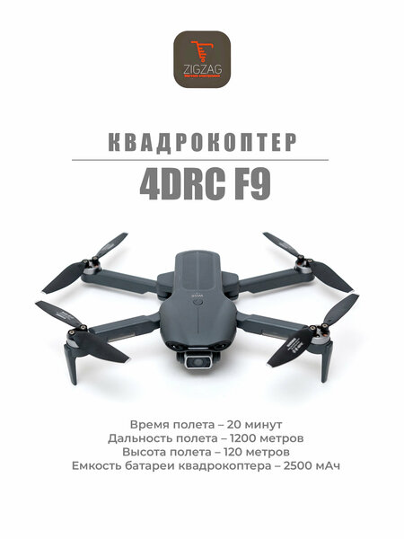 Квадрокоптер 4DRC F9 с 4K камерой и полетом 1,2 км Дрон F9 – складной, легкий, управляемый, с бесщеточными двигателями и временем полета до 20 минут. Подходит для новичков и профессионалов, порадует взрослых и детей. Дальность полёта в ясную погоду – 1200 метров, максимальная высота – 120 метров. Емкость аккумулятора – 2500 мАч, полная зарядка займет около 2 часов. На борту дрона F9 Wi-Fi 5 Ггц и камера с разрешением 4K и углом обзора 110°. Кроме того, квадрокоптер F9 оснащен интересными функциями. Функции: автоматический взлет и посадка, вид от первого лица (FPV), возврат одним нажатием, возвращение в точку взлета, интеллектуальный контроль ориентации, облет заданных точек, следование за оператором. Размеры дрона 4DRC F9: 45 x 40 x 12 см в разложенном виде, 21 x 11 x 9 см в сложенном виде. Вес - 201 грамм. В комплекте: Дрон. Пульт. 3 аккумулятора. Зарядный USB кабель. Запасные пропеллеры. Отвертка. Сумка. Инструкция.