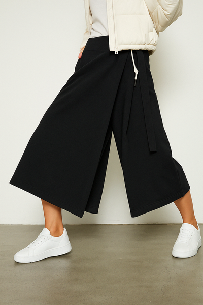 Кюлоты из трикотажа в формате юбки-брюки — это модель оверсайз, поэтому в бёдрах должны сидеть чуть свободно. При примерке выравнивайте изделие по заднему шву, чтобы оно село так, как задумано. В любом размере объем талии регулируется завязками, поэтому если кюлоты малы или слишком велики, то вы ошиблись размером. Используйте информацию об обмерах, чтобы точно подобрать свой размер. Брюки сшиты из очень качественного двухпетельчатого хлопкового футера содержащего 5% эластана. Благодаря эластану, ткань тянется, но не растягивается, долго сохраняя форму. Благодаря оригинальному дизайну с запахом спереди изделие выглядит, как юбка, а сзади, как кюлоты. Создавайте с нашими кюлотами яркие и смелые образы, которые подчеркнут вашу индивидуальность. XS/S (42-44)