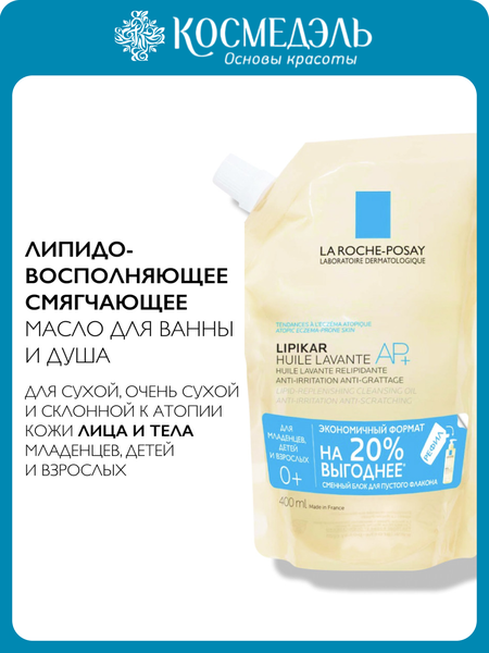 Бережно очищает и сохраняет кожу увлажненной до 24 часов. Подходит для младенцев, детей и взрослых. Протестировано под контролем дерматологов и педиатров. Рефил или сменный блок - это новая экологичная упаковка. Содержит на 73% меньше пластика, чем классический флакон Lipikar с помпой 400 мл. Перелейте содержимое сменного блока в ваш классический флакон Lipikar AP+ Oil 400 мл с помпой, не разбавляйте водой и не смешивайте с другими продуктами. активные компоненты Не содержит мыла, парабенов, этилового спирта. aqua posae filiformis – регулирует микробиом кожи масло ши – имеет сродство со структурой кожи и обеспечивает интенсивное восполнение липидов, способствуя уменьшению сухости и ощущения стянутости кожи ниацинамид – снимает зуд, предупреждает снижение защитных свойств кожи, препятствует проникновению бактериальных агентов, обладает противовоспалительным действием термальная вода La Roche-Posay – смягчает, оказывает успокаивающее действие Состав: aqua/water, glycerin, sucrose, sodium laureth sulfate, coco-betaine, sodium chloride, citric acid, niacinamide, parfum/fragrance, peg-75, shea butter, glycerides, polysorbate 20, ppg-5-ceteth-20, sodium benzoate, sodium hydroxide, vitroscilla ferment применение В душе: налейте небольшое количество Lipikar AP+ Oil на ладонь, вспеньте и нанесите на предварительно смоченную водой кожу. Аккуратно смойте масло водой. В ванне: налейте 3-5 колпачков Lipikar AP+ Oil в процессе наполнения ванны. Вытрите кожу насухо мягкими промакивающими движениями.