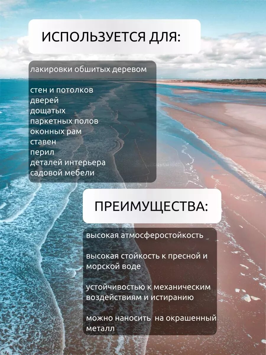 Универсальный яхтный лак объединяет в себе высокое качество и универсальность применения. Благодаря акриловой основе, этот лак идеально подходит для обработки деревянных изделий, будь то мебель, панели, полки или двери. Он обеспечивает надежную защиту от влаги, грибка и насекомых, лак обладает высокой степенью защиты от влаги, соли и ультрафиолетовых лучей, делая изделия долговечными и устойчивыми. Этот лак идеально подходит как для внутренних, так и для наружных работ. Он прекрасно подходит для обработки стен, потолков, полов, а также для защиты мебели на улице. Благодаря своей прозрачной формуле, он сохраняет натуральную текстуру дерева и придает изделиям красивый блеск. С легкостью наносится, обеспечивая ровное и гладкое покрытие. Лак яхтный матовый быстро высыхает, что позволяет завершить работу быстро и эффективно. Он также легко смывается водой, делая процесс нанесения максимально комфортным. Будь то реставрация мебели, обновление интерьера или защита деревянных конструкций, универсальный яхтный лак станет надежным помощником в вашем творчестве. Позвольте себе создать красивый и долговечный декор, который будет радовать глаза долгие годы.