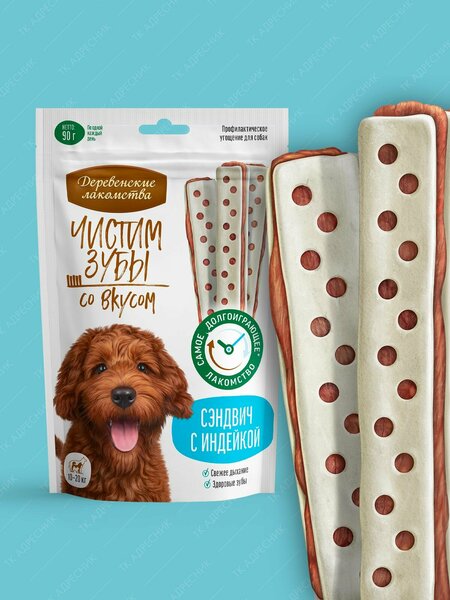 В основе «Деревенских лакомств» лежат традиции поощрения домашних питомцев, совмещенные с современными знаниями в области ветеринарии и здорового питания животных. Натуральные лакомства для собак изготовлены с учетом сбалансированного питания из качественных, безопасных и тщательно подобранных ингредиентов. Специальная профилактическая серия «Деревенские лакомства – Чистим зубы» разработана для здоровья полости пасти домашних питомцев. Супер-жевательное лакомство Сэндвич с индейкой эффективно удаляет зубной налёт, предотвращая образование зубного камня. Мясная начинка приготовлена из отборного филе индейки и не содержит искусственных консервантов и красителей. Теперь чистить зубы не только просто, но и вкусно! Лакомство предназначено для взрослых собак всех пород. *Дополнительный корм для собак (неполнорационный) для употребления между приемами основного рациона.