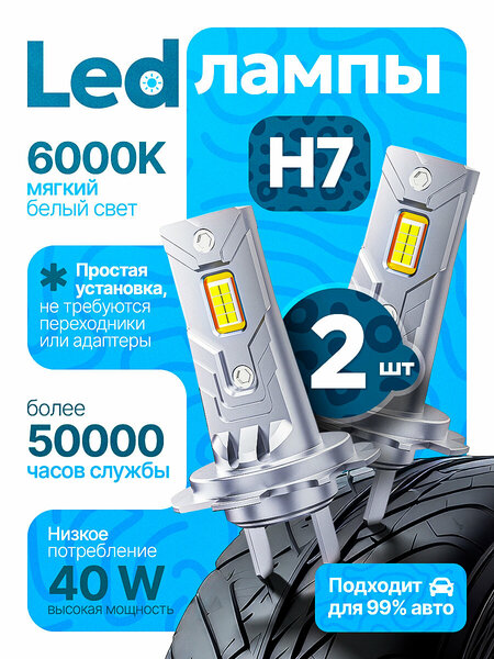 Преобразите свет вашего автомобиля! Максимальное качество по доступной цене! Светодиодные лампы H7 – это впечатляющее сочетание передовых технологий и доступной стоимости. Забудьте о тусклом свете! Наши лампы обеспечат вам превосходную видимость на дороге, повышая безопасность и комфорт вождения. В комплекте: 2 лампы H7 с цоколем (как на изображении). Основные преимущества: Яркость: На 400% ярче галогеновых ламп! Световой поток 8000 Lm. Цветовая температура: Холодный белый свет 6000К – для четкой видимости в любых погодных условиях. Мощность: 40W - низкое потребление и высокая мощность! Простая установка: Никаких адаптеров, обманок и дополнительных проводов! Просто вставьте и наслаждайтесь ярким светом. Долговечность: Более 50000 часов службы – забудьте о частой замене ламп. Надежность: Чип CSP 3570, корпус из авиационного алюминия 6063, класс влагозащиты IP67. Универсальность: Подходят для 99% автомобилей. Напряжение: 12В (работают и от 24В)