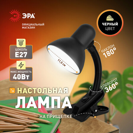 Настольная лампа ЭРА N-102-E27-40W - незаменимый атрибут, который поможет создать идеальное рабочее место, посредством хорошего освещения, для выполнения письменной работы, работы за компьютером, во время учёбы, занятий любимым хобби. Для того чтобы помочь Вам максимально просто организовать комфортное, достаточно освещенное рабочее место для различных задач, мы представляем Вашему вниманию универсальную классическую настольную лампу на прищепке. Настольный светильник выполнен в стиле лофт и идеально подходит для абсолютно любого интерьера. Такая стильная современная настольная лампа органично впишется в дизайн вашего рабочего стола и выгодно добавит ему необходимого света. Металлическая настольная лампа имеет цоколь Е27 и надёжную конструкцию. Обращаем Ваше внимание, лампочка в комплект не входит. Рекомендуем использовать светодиодные лампы LED с целью энергосбережения. Световой поток зависит от мощности применяемых ламп. Лампа эргономична и оснащена вращающимися поворотными механизмами. Высота плафона регулируется двухсекционной сгибающейся стойкой, направление света - поворотом и наклоном плафона в любом направлении. Настольная лампа прекрасно кооперируется с различными лампочками, мощностью до 40 Вт. Способ крепления такой настольной лампы-классическая струбцина. Такое крепление позволит без особых трудностей закрепить лампу на любом необходимом Вам столе. Настольный светильник лофт работает от сети 220В. Функциональный и в то же время стильный современный светильник лампа с цоколем станет незаменимым элементом декора вашего помещения. Настольная недорогая лампа для дополнительного освещения – это бюджетный способ позаботиться о себе и своих близких без особых усилий. Купив настольную лампу, Вы сможете подарить себе или своим родным возможность сполна наслаждаться работой, учёбой или своим хобби без нагрузки на зрение.