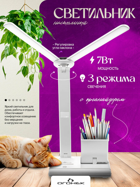 Настольная лампа с органайзером для учебы светодиодная Огонёк OG-LDP40 – это идеальный аксессуар для вашего рабочего стола, который объединяет в себе функции освещения и удобство хранения. Эта лампа создана специально для занятий, работы и чтения, делая ваш рабочий процесс более комфортным и организованным. Лампа оснащена светодиодными элементами, которые обеспечивают яркое и равномерное освещение, не напрягая глаза. Современные светодиоды известны своей долговечностью и энергоэффективностью, поэтому эта настольная лампа станет надежным помощником на долгие годы. Особое внимание привлекает наличие органайзера. Он предусмотрен для хранения мелких канцелярских принадлежностей, таких как ручки, карандаши и скрепки – все будет на своем месте и в пределах легкой досягаемости. Также предусмотрена подставка для телефона, что позволяет всегда держать смартфон под рукой и на виду. Это особенно удобно для тех, кто привык работать с электронными материалами или вести заметки с экрана телефона. Компактный и складной дизайн делает эту лампу универсальной для любых условий. Ее легко можно разместить как на маленьком письменном столе, так и на более просторной поверхности. Складная конструкция позволяет регулировать угол наклона, чтобы освещение попадало именно туда, где это необходимо, а также легко хранить лампу, когда она не используется. Эта маленькая настольная лампа выполнена в современном стиле, который подойдет к любому интерьеру – от классического до современного. Модель OG-LDP40 отличается минималистичным дизайном и высококачественными материалами, что подчеркивает ее функциональность и эстетическую привлекательность. Настольный светильник для школы станет отличным выбором для учеников и студентов, создавая идеальные условия для учебы. С таким осветительным прибором ваши занятия станут более продуктивными и комфортными. Если вы ищете настольную лампу с органайзером, светодиодную, складную и компактную, которая станет неотъемлемой частью вашего рабочего стола, настольная лампа с подставкой для телефона Огонёк OG-LDP40 – это именно то, что вам нужно. Питание: DC 5В, 1А Мощность: 7 Вт Тип диода: SMD2835 Кол-во светодиодов: 40 штук Режим температуры света: 3 штуки (3000/4500/6000К) Настройка яркости: Есть, 3 режима