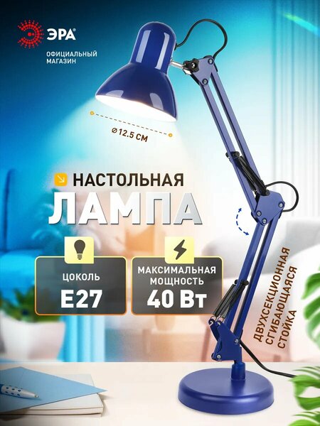 Настольная лампа ЭРА N-214-E27-40W-BU - незаменимый атрибут, который поможет создать идеальное рабочее место, посредством хорошего освещения, для выполнения письменной работы, работы за компьютером, во время учёбы, занятий любимым хобби. Для того чтобы помочь Вам максимально просто организовать комфортное, достаточно освещенное рабочее место для различных задач, мы представляем Вашему вниманию универсальную классическую настольную лампу на устойчивом основании. Лампа выполнена в стиле лофт и идеально подходит для абсолютно любого интерьера. Такая стильная современная настольная лампа органично впишется в дизайн вашего рабочего стола и выгодно добавит ему необходимого света. Металлическая настольная лампа имеет цоколь Е27 и надёжную конструкцию. Лампа эргономична и оснащена вращающимися поворотными механизмами. Высота плафона регулируется двухсекционной сгибающейся стойкой, направление света - поворотом и наклоном плафона в любом направлении. Настольная лампа из металла подойдёт в качестве достойной замены детского светильника, ночника, беспроводной лампы на батарейках или зарядке, лампы на прикроватную тумбочку, лампы для выполнения домашних заданий для школьника, а также лампы для маникюра, педикюра, макияжа. Такая удобная компактная лампа понравится любому студенту, школьнику, офисному работнику, бьюти мастеру, ребёнку и взрослому. Лампу можно использовать дома, на работе в офисе, в салонах красоты. Поэтому настольная лампа может выступить даже в качестве достойного подарка на день рождения, Новый год или 8 марта, 23 февраля. Такой подарок – это не только практичная и необходимая вещь для любого человека, но также и забота о здоровье и зрении вашего близкого человека. В такую настольную лампу Вы можете вкрутить абсолютно любой вид лампочки для создания искусственного освещения в комнате. Это могут быть лампы накаливания, компактные люминесцентные лампы (КЛЛ) или светодиодные (LED) лампы. Настольная лампа прекрасно кооперируется с различными лампочками, мощностью до 40 Вт. Способ крепления такой настольной лампы - устойчивое основание. Настольный светильник лофт работает от сети 220В. Функциональный и в то же время стильный современный светильник лампа с цоколем станет незаменимым элементом декора вашего помещения. Настольная недорогая лампа для дополнительного освещения – это бюджетный способ позаботиться о себе и своих близких без особых усилий. Купив настольную лампу, Вы сможете подарить себе или своим родным возможность сполна наслаждаться работой, учёбой или своим хобби без нагрузки на зрение.