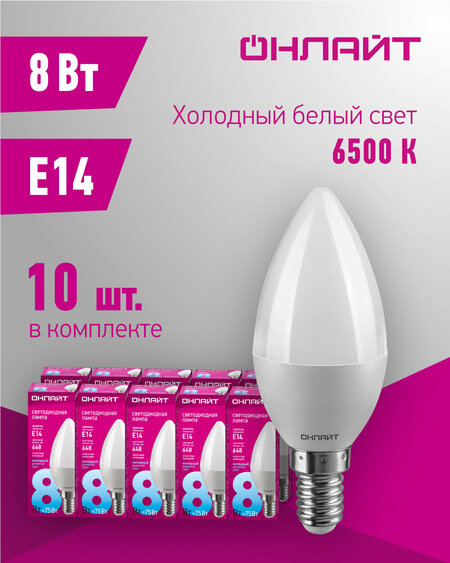 Светодиодные лампочки Е14 8 Вт 6500 К 10 шт Откройте мир качественного освещения с лампочкой Онлайт, идеально подходящей для использования в люстре или бра. Эта светодиодная лампа с цоколем E14 универсальна и эффективна, что делает ее отличным выбором для тех, кто ценит энергосберегающие технологии. Ее яркий холодный дневной свет (6500 К) идеален для создания уютной атмосферы в вашей квартире. LED лампочка Онлайт имеет массу преимуществ перед обычной лампой накаливания: ведь она работает до 10 раз дольше, экономя при этом электроэнергию. Наша светодиодная лампа в форме свечи безопасна для глаз, поэтому рекомендована для освещения детских, также подойдет для рабочих зон, кабинетов и других помещений, где необходим яркий и качественный свет. Совместимость с различными типами осветительных приборов: потолочными светильниками, накладными и подвесными люстрами и тд - делает нашу лампу идеальным решением для любого дома. Светодиодные лампы «Онлайт»