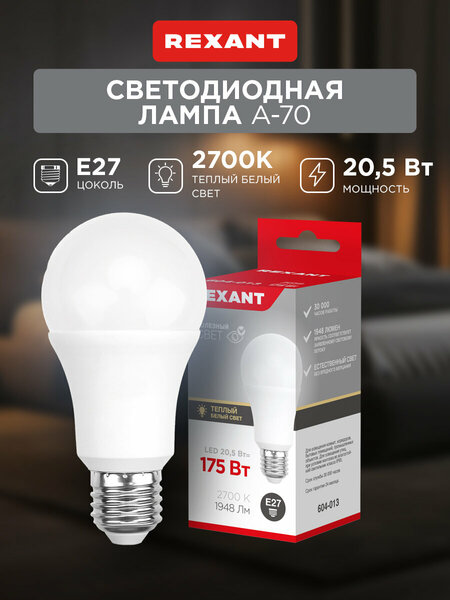 Светодиодная лампа REXANT Груша A60 20,5 Вт E27 1948 лм 2700 K теплый свет подходит для освещения комнат любого типа, домов, гостиниц, кафе, и других объектов. Светодиодные лампочки обладают высокой энергоэффективностью, износоустойчивостью и долгим сроком службы (в 20-25 раз дольше, чем лампы накаливания). За счет распространения света во всех направлениях, светодиодные лампочки REXANT потребляют еще меньше электроэнергии при более высокой яркости по сравнению с лампами накаливания. Они отличаются низким нагреванием корпуса и независимостью яркости освещения от перепадов напряжения.