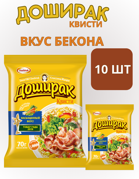 Лапша Доширак "Квисти" со вкусом бекона - это продукт быстрого приготовления, который станет незаменимым помощником в путешествиях, на работе или в дороге. В упаковке вы найдете 10 порций, что позволяет наслаждаться вкусным и сытным блюдом в любое время. Особенностью данного продукта является его вкус. Лапша с беконом придает блюду неповторимый и насыщенный вкус, который придется по вкусу любителям мясных блюд. Лапша Доширак "Квисти" не содержит глутамат натрия, ГМО и искусственные красители, что делает ее безопасной для здоровья. Состав лапши включает в себя только натуральные ингредиенты: лапшу, растительное масло, усилители вкуса и аромата, перец, соль, морковь и чеснок. Белки в 100 г продукта составляют 7,5 г, жиры - 20 г, углеводы - 49 г, а энергетическая ценность - 409 ккал. Упаковка лапши выполнена в виде пакета, что обеспечивает удобство хранения и использования продукта. Выбирая лапшу Доширак "Квисти" со вкусом бекона, вы получаете вкусное и сытное блюдо, которое всегда будет под рукой.