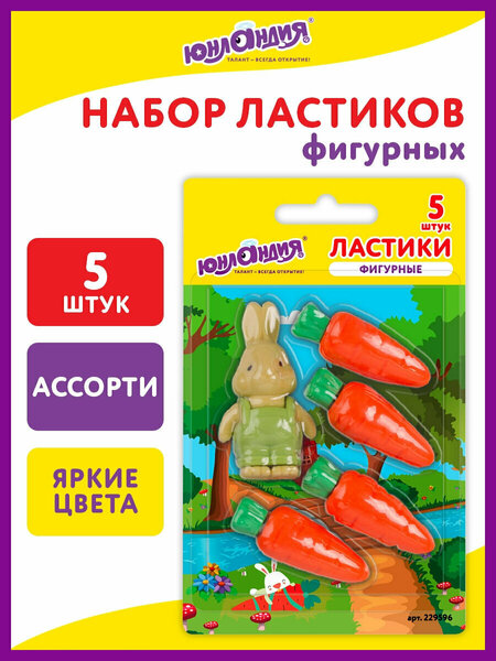 Набор фигурных ластиков ЮНЛАНДИЯ "Зайчик и урожай" станет ярким акцентом в вашей милой канцелярии. В наборе представлены пять оригинальных ластиков в форме зайчика и овощей, которые сделают процесс обучения более увлекательным. Эти школьные ластики идеально подходят для удаления чернографитных карандашей, обеспечивая лёгкое и чистое стирание без повреждения бумаги и образования пыли. С этими канцелярскими принадлежностями вы сможете не только исправлять ошибки, но и добавлять нотки веселья в каждую тетрадь. Набор поставляется в удобном блистере с европодвесом, что делает его отличным выбором для канцелярии для школы. Превратите рутинные занятия в яркие моменты с помощью данных фигурных ластиков, которые не только функциональны, но и эстетически привлекательны. Не упустите шанс сделать вашу канцелярскую яркость ещё более яркой! • Количество в упаковке: 5 шт. • Серия: Фигурные ластики. • Материал: термопластичная резина. • Форма: ассорти. • Стираемые письменные принадлежности: чернографитные карандаши. • Не оставляет бумажной пыли: да. • Размер: 43х16х16 мм. • Цвет: Зайчик и урожай. • Индивидуальная упаковка: да. • Упаковка: блистер. • Артикул производителя: 229596.