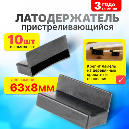 Латодержатели - это фиксаторы (крепления) ламели 63мм, необходимые для монтажа реек к деревянному основанию кровати. Латодержатель для ламелей является необходимой комплектующей для любого дивана или кровати, где используются деревянные ламели. Для долгой службы и надежного крепления ламелей ламеледержатели нужно фиксировать саморезами или мебельными скобами. Обращаем Ваше внимание, что каждый вид держателя ламелей изготовлен с учетом допуска под определенный размер ламель для кровати. Наши латодержатели для кровати — это идеальное решение для поддержания комфорта и безопасности вашего спального места. Универсальная мебельная фурнитура для ламелей подходит для большинства стандартных реек, обеспечивая легкую и быструю установку. Изготовлены из высококачественного пластика, который обеспечивает долговечность и устойчивость к деформации. Подходят для деревянных и металлических рам кроватей.