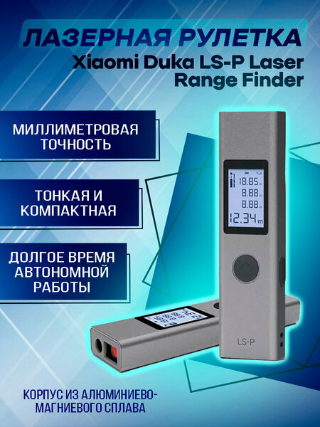 Лазерная рулетка (дальномер) Xiaomi Duka LS-P Laser Range Finder обладает большим набором функций. Непрерывное измерение, разметка равных отрезков, измерение площади и объема, измерение расстояний от заднего и переднего торца прибора. Выполняет функции Пифагора, измеряет величины углов и максимальные и минимальные расстояния. Заряжается дальномер с помощью usb кабеля. Емкость аккумулятора 200 мА/ч, одной полной зарядки хватает на 3500 измерений. Качественные комплектующие электронного инструмента это – оптико-электронный модуль First Sensor, микропроцессор ST, TDK индуктор (твердотельный конденсатор) и микросхема Silicon Labs. Корпус выполнен из алюминиево-магниевого сплава. Измерительный прибор упростит процесс измерения в разы. Лазерный метр легко и быстро определит площадь квартиры, высоту дверей и окон, размер дивана или угол наклона лестницы. Точность измерений строительного инструмента до 0,1 мм, а время измерения составляет 0,2 сек. Измерительный лазер с дисплеем надежный помощник в проведении ремонта, который всегда под рукой. Данный товар будет прекрасным подарком для каждого строителя. Приятных покупок!