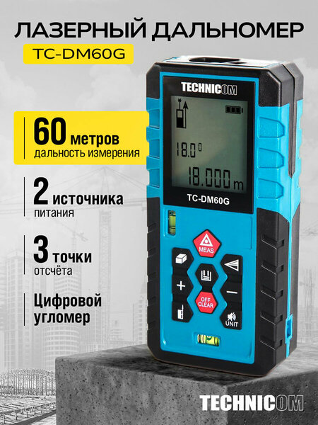 Лазерный дальномер TC-DM60G – небольшой, удобный, точный прибор для проведения измерений на расстоянии 60 метров. Все измерения можно проводить в метрах, футах или дюймах. Отличительными чертами данного дальномера являются: скорость проведения измерений 0,25с, два источника питания: встроенный аккумулятор и батарейки, цвет лазерного луча зеленый, информативный четырехстрочный дисплей, два пузырьковых уровня, отверстие под штатив ¼”, степень влагозащиты IP54. Для удобства эксплуатации данный прибор оснащен тремя точками отсчета. C помощью лазерного дальномера TC-DM60G можно выполнять все основные типы измерений: расстояние до объекта, длина, ширина, высота, вычисление площади и объема, специфические измерения, такие как функция Пифагора.