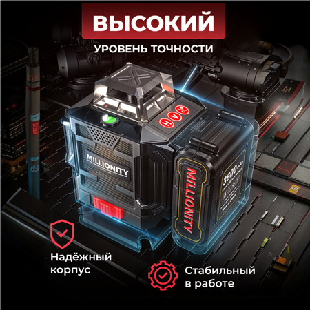 Лазерный уровень Millionity — самовыравнивающейся электронный прибор, который предназначен для внутренней отделки помещений, установки оборудования, выравнивания стен и пола, установки потолочных конструкций, перегородок и монтажа настенного оборудования, нивелировки настенных полок и другое. Работает под углом 360 градусов. Если вы хотите получить наилучший результат при строительстве или ремонте, то нивелир является одним из обязательных инструментов, которым нужно владеть. Он имеет 16 зелёных линий. С помощью них можно создавать в пространстве визуальные плоскости до 30 метров, что позволяет использовать его как для мелких работ, так и для больших проектов. Лазерный уровень имеет несколько режимов работы. При включении лазерного уровня загорается цифровой дисплей с индикатором заряда. Нажимая кнопки Н и V вы можете выбрать соответствующие лазерные линии. Мощный луч, который проецирует линии на потолочную и стеновые поверхности. Также он оснащён зелёным лазером, что делает его более точным и видимым в условиях яркого освещения. Имеет регулируемую подставку (основание), которая позволяет установить его настойке, трипод или на штативе. В комплект входят пульт управления, кейс для хранения, зарядное устройство для батарей. Два аккумулятора, подставка (платформа), трипод и настенный держатель. Резьба для установки на штатив или трипод имеет разъём 1/4˝дюйма. В комплекте имеется переходник с 1/4˝дюйма на 5/8˝дюйма. Прибор пригоден как для эксплуатации в закрытых помещениях, так и на открытых строительных площадках. Это позволяет использовать изделие при любых условиях и обеспечивает длительное время работы. Лазерный уровень 4D также имеет возможность проецировать линии в 3D модели, что поможет вам точно определить расположение стен, потолков, окон и других элементов. Данный инструмент для мужчин поможет достичь наилучшего результата при любых строительных работах.