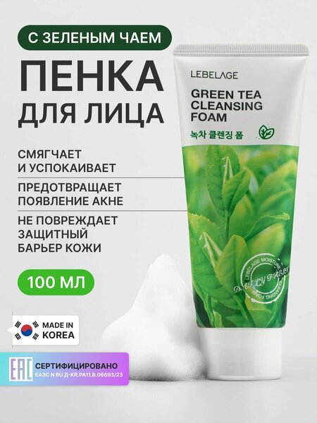Lebelage Пенка для умывания, для снятия остатков макияжа, для ухода за кожей лица, шеи и зоны декольте с экстрактом зеленого чая, корейская косметика. 100 мл