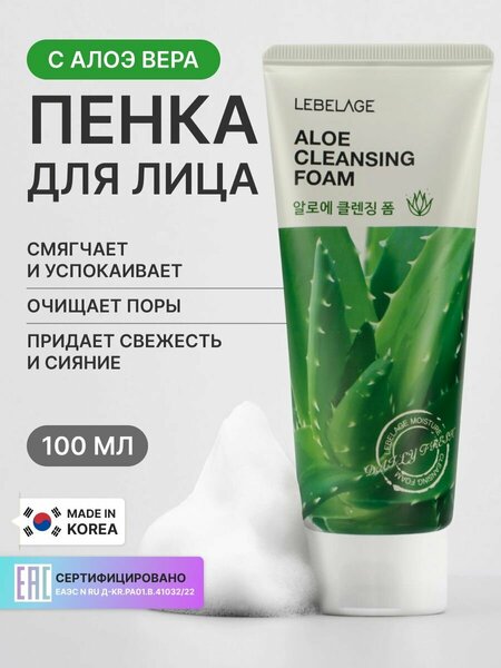 Пенка для умывания, для снятия остатков макияжа, для ухода за кожей лица, шеи и зоны декольте Корея с экстрактом алоэ эффективно и бережно удаляет загрязнения, излишки себума и ороговевшие клетки, очищает поры, не пересушивая кожу и не оставляя неприятного чувства стянутости. Пенка делает кожу мягкой, гладкой, чистой и комфортной. Для любого типа кожи, в том числе для проблемной и чувствительной. Применение: вспеньте средство и нанесите на влажную кожу лица массирующими движениями, затем смойте теплой водой. Идеальный подарок женщине, маме, подруге, девушке, любимой на день рождения, Новый год, 8 марта, день Святого Валентина. Рекомендуется к использованию в комплексе с серией косметики для ухода за лицом и телом Lebelage.