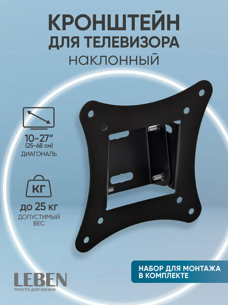 Кронштейн для телевизора наклонный LEBEN - это надежное и функциональное решение для установки вашего телевизора на стене. Кронштейн LEBEN позволяет легко менять положение телевизора в вертикальной плоскости, поднимая или опуская экран на нужную высоту. Это обеспечивает комфортное использование телевизора и позволяет избежать усталости глаз при длительном просмотре. Прочный материал из стали обеспечивает высокую надежность и долговечность кронштейна. Максимальная нагрузка составляет 25 кг, что позволяет использовать кронштейн для телевизоров с диагональю от 10 до 27 дюймов. Угол наклона вверх и вниз составляет 15 градусов, что позволяет настроить оптимальное положение экрана для комфортного просмотра. Кронштейн LEBEN подходит для телевизоров с креплениями стандарта VESA 75x75 мм и 100x100 мм. Комплектация кронштейна включает в себя сам кронштейн, набор для монтажа и подробную инструкцию по установке. Выбирая кронштейн для телевизора наклонный LEBEN, вы получаете надежное и удобное решение для установки вашего телевизора на стене, которое обеспечит комфорт и безопасность использования.
