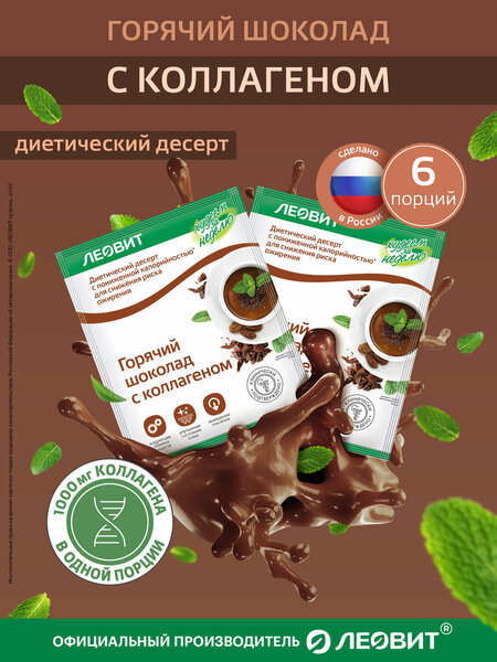 Горячий шоколад с коллагеном от леовит из линейки «Худеем за неделю» – вкусный и полезный напиток, разработанный для комфортного похудения, вы можете наслаждаться чашечкой ароматного шоколада, получая пользу для здоровья и коррекции веса тела. Продукт понравится любителям шоколадок, при этом он может входить в состав низкокалорийной диеты. Какао содержит кофеин – стимулятор, он заряжает энергией, повышает работоспособность. Шоколад – натуральный антидепрессант, он улучшает настроение. В составе напитка быстрого приготовления витамины для снижения веса тела (витамины A, E, B6). Пектин – антиоксидант, он хорошо влияет на микрофлору кишечника. Коллаген нужен для здоровья суставов. Приготовить горячий шоколад для похудения просто. Высыпите содержимое пакетика в чашку, залейте 150 мл кипящей воды, перемешайте, время готовности – несколько минут. Пищевая ценность (средние значения) в 100 г сухого продукта/% ССП**: белки – 9 г/12, в том числе коллаген – 3,85 г/-, жиры – 7 г/8, углеводы – 41 г/11, инулин – 19,2 г/768***, пищевые волокна – 20,9 г/70, витамин Е – 17,3 мг/173, витамин В6 – 2,3 мг/115, витамин А – 967 мкг/121, энергетическая ценность – 1110 кДж(260 ккал)/11. ** ССП - средняя суточная потребность в соответствии с ТР ТС 022/2011