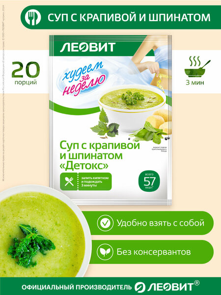 Уникальный детокс-суп для очищения организма из коллекции блюд «Худеем за неделю». Всего 56 ккал на одну порцию. Мы приготовили этот суп по уникальному рецепту, дополнив его вкусными и полезными ингредиентами — шпинатом и крапивой. Шпинат называют «королем овощей» благодаря богатому содержанию белков, витаминов, макро- и микроэлементов, необходимых человеку. Крапива обладает общеукрепляющим, тонизирующим и противовоспалительным действием. Полезный суп для похудения также содержит инулин, который улучшает пищеварение, ускоряет очищение организма от шлаков и токсинов. Просто залейте содержимое пакетика горячей водой, и через 3 минуты суп готов. Попробуйте наше блюдо – мы приготовили его по уникальному рецепту, наделив дополнительной полезностью и особым вкусом. В нем содержится инулин, который полезен для нормального пищеварения, ускоряет очищение организма от шлаков и токсинов. Крапива дополняет вкус супа, делая его более насыщенным. Вы сможете легко и быстро приготовить такое блюдо – достаточно залить его кипятком на 3 минуты. Наш суп удобно взять с собой, например, на работу.