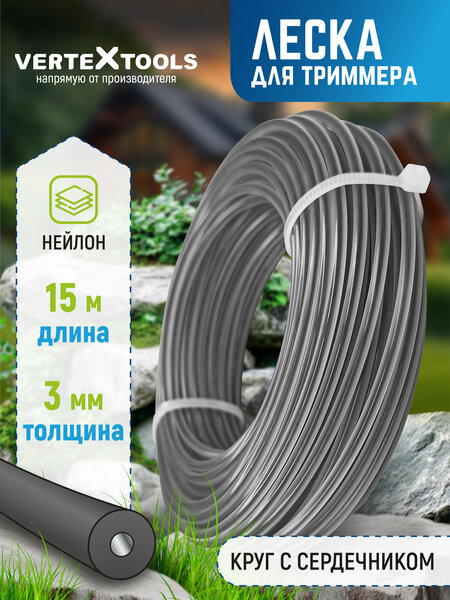 Леска для триммера VertexTools 3 мм 15 м круглая с сердечником
