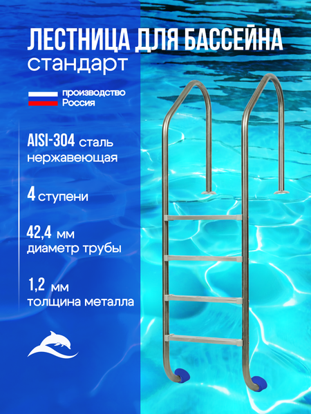 Лестницы односторонние: 4 ступени (Стандарт, Компакт, Компакт + ) Диаметр трубы - 42,4 мм. Толщина металла - 1,2 мм. Нижние опоры с регулировкой по углу. Лестницы не комплектуются стаканами для бетонирования. Способ монтажа: под анкерные крепления (приобретаются отдельно, артикул на площадке 4619885667) Лестницы подходят для бассейнов высотой 150 см. В комплекте: Лестница Ступени с противоскользящим рифлением Декоративные заглушки Болты