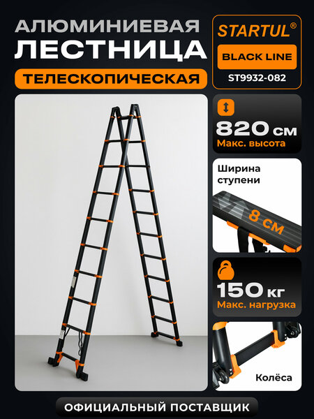 Лестница телескопическая алюминиевая двухсекционная 820 см 28,8 кг STARTUL Black Line (ST9932-082) - незаменимый инструмент для проведения ремонтных, строительных и монтажных работ любой сложности. Телескопическая конструкция лестницы обеспечивает максимальную высоту до 820 см, что позволяет использовать ее для работы на высоте. Телескопическая лестница оснащена широкими ступенями глубиной 8 см. Рифленая противоскользящая поверхность ступеней обеспечивает безопасность при работе, а также предотвращает случайное скольжение. Лестница телескопическая обладает усиленном шарнирным соединением, что гарантирует безопасность и комфорт во время работы. 2 колесика и 2 траверсы обеспечивают легкость перемещения и устойчивость конструкции, а 4 дополнительных прорезиненных стабилизатора гарантируют стабильность. Автоматическая фиксация ступеней и надежная система блокировки от непроизвольного складывания обеспечивают безопасность и удобство использования. Лестница строительная выполнена из алюминия, что обеспечивает ей высокую прочность и коррозионную стойкость. В сложенном виде лестница алюминиевая занимает компактные размеры, что облегчает ее хранение и транспортировку. Лестница складная STARTUL Black Line (ST9932-082) может использоваться как лестница приставная или стремянка. Максимальная нагрузка на данную алюминиевую лестницу составляет 150 кг. Лестница стремянка STARTUL Black Line (ST9932-082) выполнена в стильном черном цвете, что придает ей современный и элегантный вид. В комплект поставки входят: раздвижная лестница, 2 колесика, 2 траверсы, 4 прорезиненных башмака и 4 оранжевых прорезиненных стабилизатора. Лестница двухсекционная STARTUL Black Line (ST9932-082) - это надежная, удобная и функциональная складная лестница, которая станет вашим помощником при выполнении различных строительных и ремонтных работ.