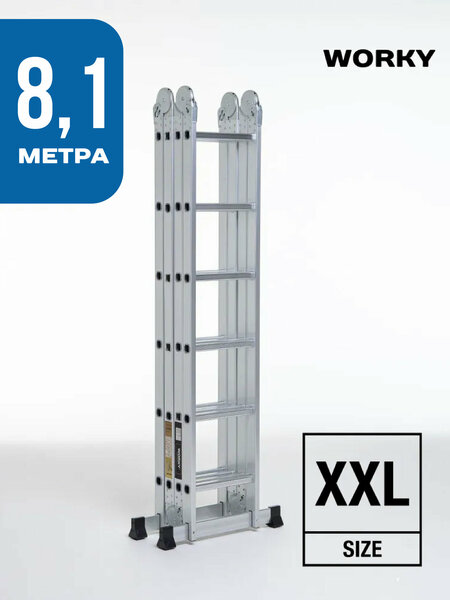 Лестница-трансформер - это удобный универсальный инструмент для работ на разной высоте. Она может использоваться как двусторонняя стремянка, приставная лестница или помост. Трансформер объединяет в себе функции нескольких лестниц и подходит как для бытовых задач, так и для профессионального использования. Лестница-трансформер состоит из нескольких секций, соединенных между собой шарнирами, которые обеспечивают подвижность, позволяя менять форму и положение лестницы. В сложенном виде конструкция очень компактна и легко помещается в шкаф, кладовку или багажник автомобиля. По обоим краям лестницы установлены поперечные опоры (траверсы) с пластиковыми наконечниками (“башмаки”). Они обеспечивают надежную фиксацию во время работы и предотвращают скольжение. Трансформеры изготавливаются из прочного алюминия, благодаря чему обладают небольшим собственным весом и стойкостью к коррозии: стремянку можно использовать на открытом воздухе и даже под атмосферными осадками. Алюминиевая лестница трансформер — надёжная конструкция, которая подойдёт для выполнения различных работ. Перемещать её не составит труда, так как лестница имеет небольшой вес и компактный габаритный размер. Ширина секции 350мм! Максимально допустимая нагрузка составляет 150 кг. Изготовлена по современным технологиям из качественного алюминия и снабжена высокопрочными шарнирами (замками) из стали. Рифленые ступеньки обеспечат хорошее сцепление стопы с поверхностью. Противоскользящие заглушки из резинопластика не поцарапают полы и добавят конструкции устойчивости на скользких и неровных покрытиях. Устойчивость лестницы обеспечивают широкие поперечные траверсы. Вес лестницы 16 кг.
