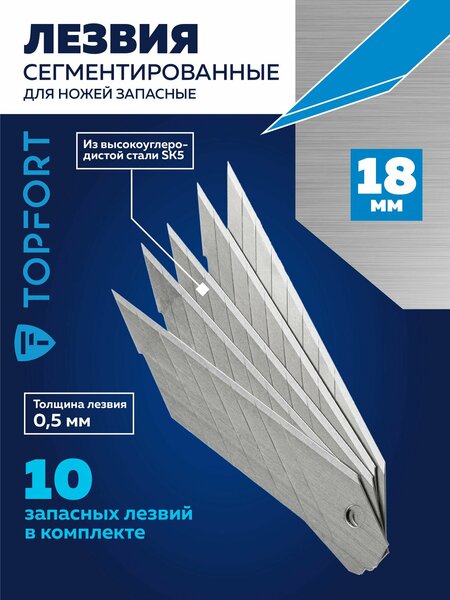 Сменные лезвия для канцелярских ножей - это незаменимый аксессуар для каждого, кто ценит качество и удобство в работе. В упаковке содержится 10 сегментированных лезвий шириной 18 мм и толщиной 0,5 мм, что делает их идеальными для точной и аккуратной резки различных материалов. Каждый элемент обеспечивает превосходную остроту и долговечность, благодаря чему ваши канцелярские ножи будут служить долго. Изготовлены из высокоуглеродистой стали SK5. Угол наклона лезвий 30 градусов Используются для резки широкого спектра материалов: ткани, бумаги, кожи, пленки и т. п. При работе с лезвиями используйте средства защиты. Не утилизируйте лезвия с бытовыми отходами. Хранить в недоступном для детей месте. Качественные и надежные сменные лезвия для канцелярского ножа станут отличным выбором. Ваша работа будет выполнена максимально эффективно и с минимальными затратами усилий. Лезвия обрабатываются с учетом всех современных стандартов, что гарантирует их долговечность и надежность в использовании.