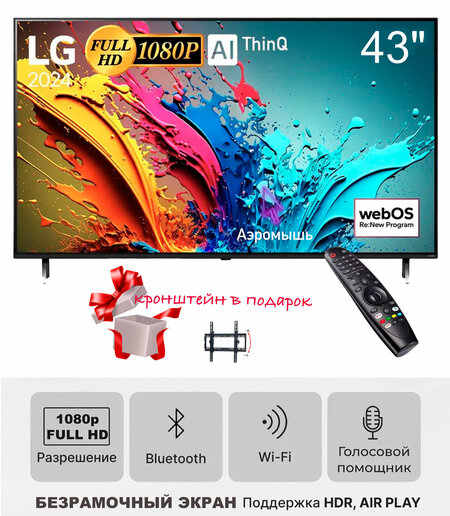 LG-ThinQ AI & with new function Magic Remote - обновлённая версия и производство 2024 года - диагональ экрана 109 см (43 дюйма) с LED подсветкой и ярким дисплеем. Отличная картинка в Full HD. Пульт Magic Remote в комплекте, а это голосовое управление и удобная навигация и набор текста в Ютубе. Качественная сборка.