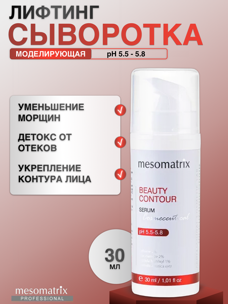 Лифтинг сыворотка для лица и век с пептидами и кофеином от отеков, морщин, следов постакне Beauty Contour Mesomatrix. Антивозрастная пептидная сыворотка от темных кругов и мешков под глазами, эффективно разглаживает морщины, глубоко увлажняет. Моделирующая, корректирующая, лимфодренажная сыворотка для укрепления овала лица, лифтинга подбородка и шеи, уменьшения отечности на лице. Подтягивающая противоотечная сыворотка флюид для лица уплотняет и тонизирует кожу, уменьшает морщины (антивозрастное действие). Кофеин - ускоряет лимфодренаж, тонизирует сосуды. Пептидный комплекс оказывает омолаживающее, стимулирующее, лимфодренажное действие. Пептиды для лица активизируют синтез коллагена и эластина, восстанавливают тургор. Ниацинамид - осветляет пигментные пятна и пигментации, выравнивает тон лица. Гиалуроновая кислота - глубоко увлажняет кожу, удерживает влагу, повышает упругость кожи. Масло миндаля - питает, смягчает кожу. Витамин Е - антиоксидант, питает и восстанавливает кожу. Троксерутин - тонизирует сосуды, уменьшает проявления купероза. Ментол и эфирное масло мяты - охлаждает, уменьшает отечность. Нанести на очищенную кожу лица легкими движениями. Применять 1-2 раза в день, курс 30-90 дней. Для всех типов кожи с возрастными изменениями, при отечности, для зрелой, сухой, атоничной кожи. Для ухода за возрастной кожей, от 30+. Увлажняющая и омолаживающая сыворотка для лица для тонкой чувствительной кожи, для комбинированной кожи с отеками и широкими порами. Средство для аппаратных процедур - для микротоков, микротокового массажа, электропорации (с применением контактного геля). Альтернатива крему от отеков на лице и под глазами.