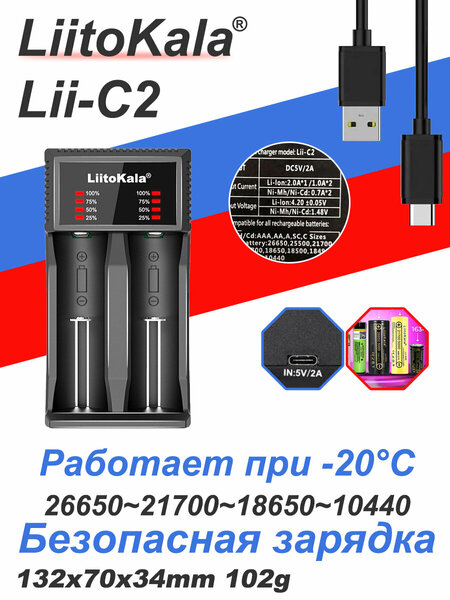 Руководство по эксплуатации зарядного устройства Lii-C2 I. Внимание. 1. данное зарядное устройство может заряжать только цилиндрические литий-ионные аккумуляторы (3,7 В), NiMH/NiCd (1,2 В); 2. перед использованием, пожалуйста, внимательно ознакомьтесь с инструкцией, обратите внимание на рекомендуемый ток зарядки аккумулятора, не превышайте рекомендуемый ток зарядки; 3. используйте адаптер постоянного тока 5В, выходной ток должен быть не менее 2А; 4. во время зарядки зарядное устройство может нагреваться, поэтому будьте осторожны, чтобы не обжечь руки; 5. при прекращении использования, пожалуйста, отключите питание и отсоедините аккумулятор; 6. его можно использовать только в обычных помещениях. 7. данные тестирования продукта приведены только для справки, фактическая ситуация, пожалуйста, обратитесь к профессиональным инструментам. Спецификации и функции зарядного устройства. 1. 5V/2A вход, 2 слота независимой зарядки и микрокомпьютерной системы управления. 2. ток зарядки интеллектуальный и автоматический выбор, есть 3 класса (700 мА/1000 мА/2000 мА). 3. светодиодный индикатор зарядки может показывать состояние зарядки 25% 50% 75% 100%. 4. автоматическая идентификация литиевых (Li-Ion 3.7V) и никель-металлгидридных (Ni-MH) аккумуляторов. 5. функция активации напряжения 0 В, 1,65-2,20 В не может заряжать (но будет активирован ток струйной зарядки). 6. множество защитных функций, таких как защита от перезарядки, разрядки, короткого замыкания, обратного подключения и т. д. В то же время, устройство может интеллектуально и автоматически определять плохие батареи; 7. режим зарядки: постоянный ток и постоянное напряжение. Описание светодиодного дисплея. После подключения зарядного устройства к источнику питания, все светодиодные индикаторы зарядки загораются мгновенно, если батарея не помещена в гнездо для зарядки, все индикаторы гаснут. Когда батарея обнаружена, индикатор питания будет мигать ярко, 4 индикатора также будут в зависимости от количества энергии, чтобы зажечь соответствующие огни, 4 огни всегда включены означает полный, 4 огни в то же время мигает означает, что батарея является ненормальным. Электрические технические параметры. 1, входная мощность: DC 5V 2A 2, выходное напряжение: DC 4.2V для Li-Ion DC 1.48V для NiMH/NI-Cd 3. выходной ток: Li-Ion: 2000mA*1, 1000mA*2 NiMH/NiCd: 700mA*2 4、Постоянный ток, постоянное напряжение зарядки, ток отключения: <100 мА. 5、Ток в режиме ожидания: <15.0m A. V. Совместимые типы и модели аккумуляторов Li-ion: 26650, 21700, 20700, 18650, 18490, 17670, 17500, 14500, 10440 NiMH/Cd: AA, AAA, SC, C VI. Размер зарядного устройства. 132 мм x 70 мм x 34 мм (Д/Ш/В) Вес: 102 г (без зарядного кабеля)