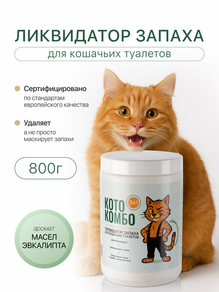 «КОТОКОМБО» - современное сертифицированное средство по уходу за домашними животными. Производится по европейским стандартам. Средство «КОТОКОМБО» поможет поддерживать чистоту и свежесть в вашем доме. Свойства продукта: 1. Ликвидирует запах мочи и фекалий животных. 2. Содержащиеся в гигиеническом средстве вещества полностью уничтожают причину неприятного запаха. 3. Дезинфицирует место обработки, уничтожая до 99% болезнетворных бактерий. 4. Универсальное средство для всех видов наполнителей, увеличивая срок их службы втрое. Не содержит химических веществ - 100% натуральный продукт. Безопасен для людей и животных. Обладает приятным ароматом. Представляем вам наш нейтрализатор запаха — инновационное средство, которое легко и эффективно справляется с проблемой неприятного запаха в кошачьем туалете. Данная формула была специально разработана для ликвидации запаха кошачьей мочи и других неприятных ароматов, характерных для домашних питомцев. С помощью нашего уникального ликвидатора запаха для кошачьего туалета вы забудете о сильных и резких запахах, которые могут возникать в процессе эксплуатации лотка. Нейтрализатор запаха кошачьей мочи не только помогает устранить запах, но и активно борется с бактериями, благодаря чему вы получаете не только свежесть, но и дезинфекцию поверхности. Это средство от запаха кошачьей мочи обеспечивает долгосрочный эффект, позволяя вам насладиться чистотой и уютом в вашем доме. Поглотитель запаха для лотка работает на основе природных компонентов, что делает его безопасным для ваших любимцев и окружающей среды. Более того, использование данного средства от запаха мочи позволяет существенно экономить наполнитель, так как он хорошо устраняет запахи и предотвращает их возникновение. Просто следуйте нашему простому руководству по применению: насыпать ½ часть порошка из банки ровным слоем на дно сухого туалетного лотка, сверху положить наполнитель. Если вы используете комкующийся наполнитель, мы рекомендуем смешать его с ликвидатором запаха для достижения наилучшего эффекта. Не упустите возможность избавить себя от постоянной борьбы с неприятными запахами и обеспечьте своему питомцу комфортное пространство. Выберите наше средство и насладитесь беззаботной жизнью с вашим пушистым другом! Меры предосторожности: Беречь от детей. В случае попадания в глаза промыть водой. При необходимости обратиться к врачу. Запрещается использовать пустые банки для пищевых целей. Условия хранения: Хранить в закрытой упаковке производителя, в сухом защищенном от солнечных лучей месте, недоступном для детей и животных, отдельно от пищевых продуктов и кормов, при температуре от 0С° до 30С°. Не применять по истечении срока годности. Состав: комплексный минеральный природный адсорбент, диспергатор сухой минеральный, растительные компоненты, абсорбент, масло эфирное пихтовое. Масса нетто: 800 грамм.