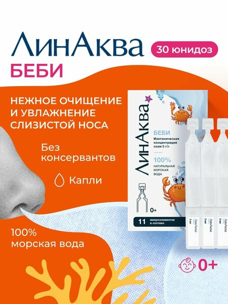 НЕ содержит консервантов. Без использования бензалкония хлорида. Морская вода для промывания носа — это эффективное средство для ежедневного ухода за носовой полостью и профилактики заболеваний, таких как простуда, грипп ОРВИ. Раствор ЛинАква создан на основе натуральной морской воды, которая богата минералами и микроэлементами, способствующими укреплению местного иммунитета и защите слизистой оболочки носа. Применение морской воды помогает смыть излишки слизи, пыль, аллергены и бактерии, способствуя улучшению дыхания и снижению риска развития простудных заболеваний. Спрей для носа на основе морской воды идеально подходит для использования в сезон простуд и гриппа, особенно в период повышенной угрозы вирусных инфекций. Морская вода для промывания носа выпускается в четырех формах, каждая из которых имеет уникальную концентрацию солей и минералов, что позволяет подобрать оптимальный вариант для любого возраста и состояния здоровья:1. ЛинАква Бейби — это вариант с самой низкой концентрацией соли, который разработан специально для детей с самого рождения. Его мягкое действие делает его безопасным даже для самых маленьких пациентов. В комплекте идет специальная насадка — «мягкий душ», обеспечивающая нежное и комфортное промывание носа. Благодаря щадящему воздействию морской воды, «Бейби» помогает очищать носовые проходы у младенцев, устраняя слизь и предотвращая сухость слизистой оболочки.2. ЛинАква Софт — мягкий спрей для носа с низкой концентрацией соли, который подходит как для взрослых, так и для детей с 2 лет. В комплект входит две насадки: «струя» и «мягкий душ». Это позволяет выбирать между более интенсивным промыванием и мягким орошением, что особенно важно для людей с чувствительной слизистой оболочкой или склонностью к аллергическим реакциям. Софт отлично подходит для ежедневного использования в качестве профилактики, особенно в холодное время года или в условиях пониженной влажности воздуха.3. ЛинАква Норм — морская вода с классической концентрацией соли, рекомендованная для взрослых и детей от 2 лет. Этот спрей помогает эффективно справляться с заложенностью и обеспечивает интенсивное промывание носовых проходов. В комплекте идет насадка «струя», которая позволяет точечно и эффективно промывать нос. Морская вода помогает не только очищать слизистую от пыли и аллергенов, но и улучшать дыхание, предотвращая развитие простуды и гриппа.4. ЛинАква Форте — это вариант с повышенной концентрацией соли (гипертонический раствор), предназначенный для более интенсивного воздействия. Морская вода в форме «Форте» идеально подходит для взрослых и детей с 2 лет, страдающих сильной заложенностью носа или воспалительными заболеваниями. Гипертонический раствор способствует удалению излишней слизи и снижению отека слизистой оболочки. В комплекте к этому варианту также прилагается насадка «струя», что обеспечивает эффективное промывание носа даже при сильной заложенности. Морская соль является основным действующим компонентом этих средств, который благодаря своим природным свойствам помогает восстанавливать нормальную работу слизистой оболочки носа. Промывание носа морской водой способствует увлажнению, очищению и защите носовой полости от негативного воздействия внешней среды. Применение морской в