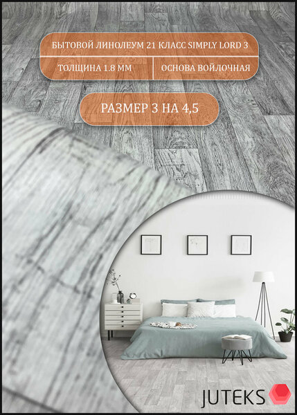 Линолеум 3 на 4,5 (цельный рулон, пополам не складывается) Линолеум для пола Simply LORD 3 – это практичное и элегантное решение для обустройства различных жилых помещений. Его можно стелить в гостиных, спальнях, детских комнатах, прихожих и кухнях. Если вы хотите придать своему дому стильный и современный вид, то линолеум для пола на отрез на войлочной основе - это идеальное решение для вас. Линолеум бытовой, 21 класс, толщина 1,8 мм. На войлочной основе (на разрыв идет тяжело). Подходит для тех кто хочет обновить пол, но не хочет покупать дорогой материал. При укладке линолеума советуем проклеить его клеем, подложка пропитывается и линолеум становится жёстким, прослужит вдвое дольше. По правилам укладке любой линолеум нужно проклеить клеем перед тем как класть его. Особенности и краткие характеристики линолеум на отрез Simply LORD 3: - Устойчив к деформациям и обладает замечательной звукопоглощающей способностью; - Совместим с систем ой теплый пол (до 27гр); - Структура покрытия имеет легкий рельеф; - Класс применения - 21; - Толщина - 1,8мм; - Основа - Войлочная; - Цвет– Серый; - Дизайн - Дерево; - Страна – Россия. важно! Линолеум отрезается от рулона по размерам покупателя, поэтому товар надлежащего качества возврату не подлежит.