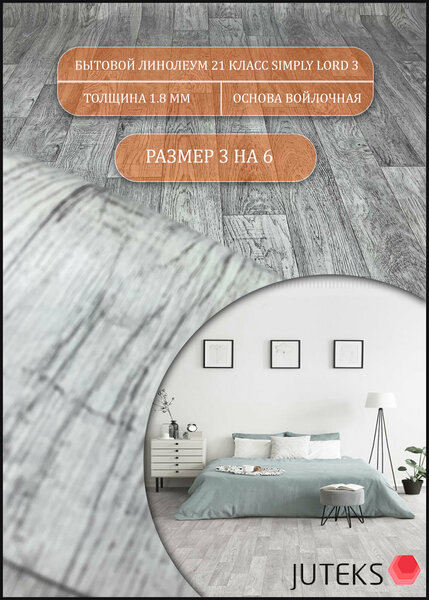 Линолеум 3 на 6 (цельный рулон, пополам не складывается) Линолеум для пола Simply LORD 3 – это практичное и элегантное решение для обустройства различных жилых помещений. Его можно стелить в гостиных, спальнях, детских комнатах, прихожих и кухнях. Если вы хотите придать своему дому стильный и современный вид, то линолеум для пола на отрез на войлочной основе - это идеальное решение для вас. Линолеум бытовой, 21 класс, толщина 1,8мм. На войлочной основе (на разрыв идет тяжело). Подходит для тех кто хочет обновить пол, но не хочет покупать дорогой материал. При укладке линолеума советуем проклеить его клеем, подложка пропитывается и линолеум становится жёстким, прослужит вдвое дольше. По правилам укладке любой линолеум нужно проклеить клеем перед тем как класть его. Особенности и краткие характеристики линолеум на отрез Simply LORD 3: - Устойчив к деформациям и обладает замечательной звукопоглощающей способностью; - Совместим с систем ой теплый пол (до 27гр); - Структура покрытия имеет легкий рельеф; - Класс применения - 21; - Толщина - 1,8мм; - Основа - Войлочная; - Цвет– Серый; - Дизайн - Дерево; - Страна – Россия. ВАЖНО! Линолеум отрезается от рулона по размерам покупателя, поэтому товар надлежащего качества возврату не подлежит.